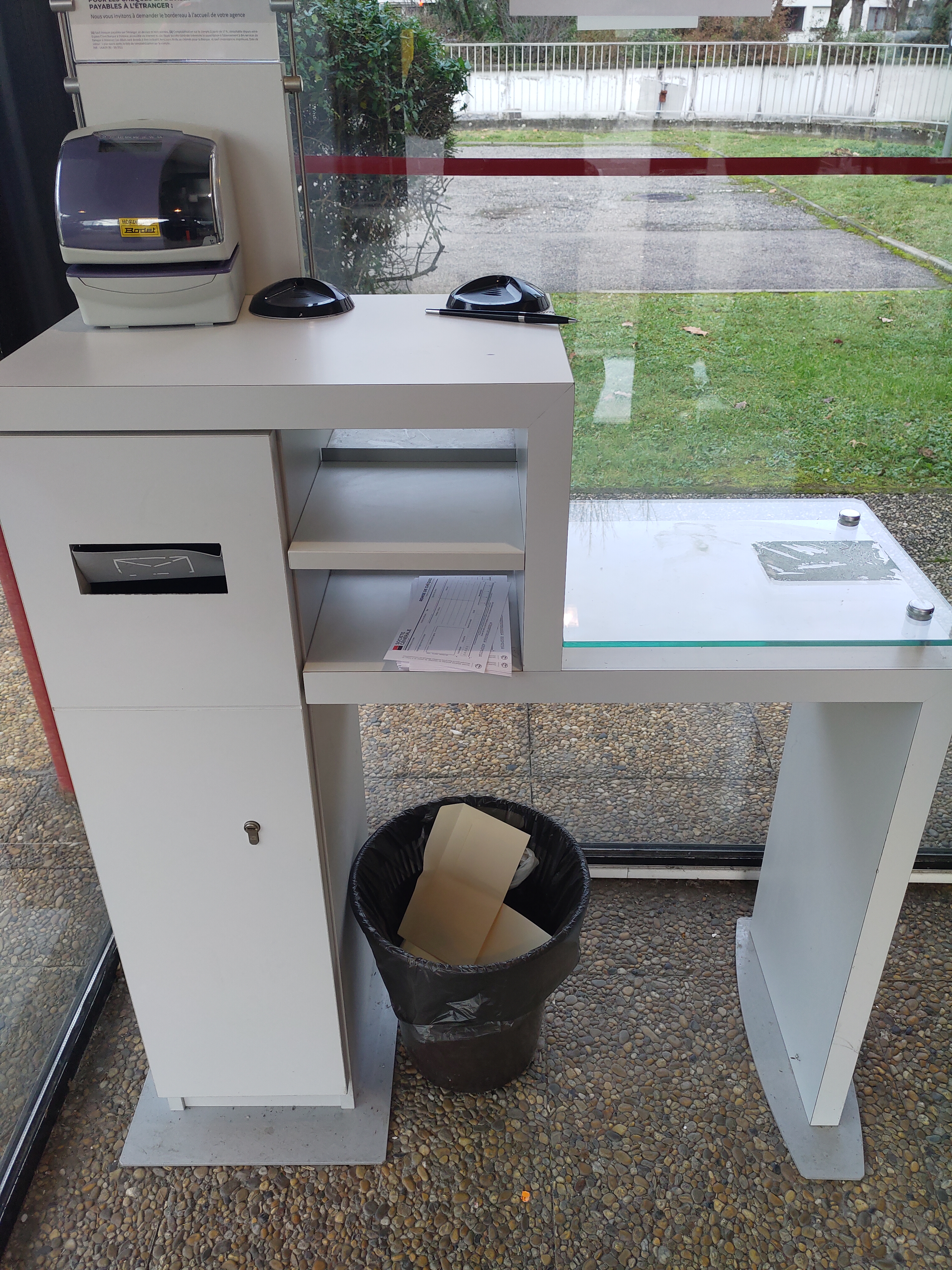 Fermé de 12 a 14 hr contrairement a ce qui est ecrit sur googlemaps. Pas de stylo a la borne de dépôt de chèque...